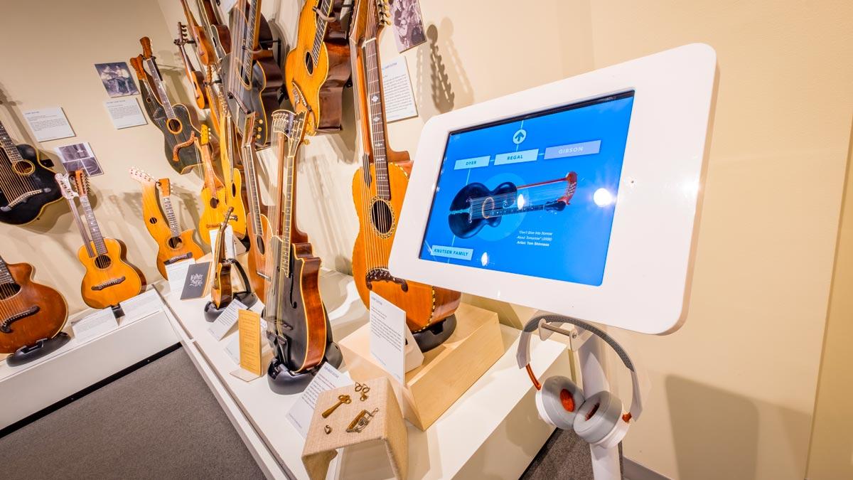 All of the instruments in this exhibition were loaned to the Museum of Making Music by The Miner Museum of Vintage, Exotic & Just Plain Unusual Musical Instruments, except for the Emerald Synergy X7 Artisan Harp Guitar that is owned by the Museum of Making Music, and those noted below: